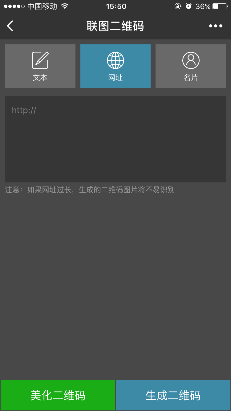 联图二维码是一款二维码生成器,能把文本、网址、名片等文本内容生成对应的二维码图片!