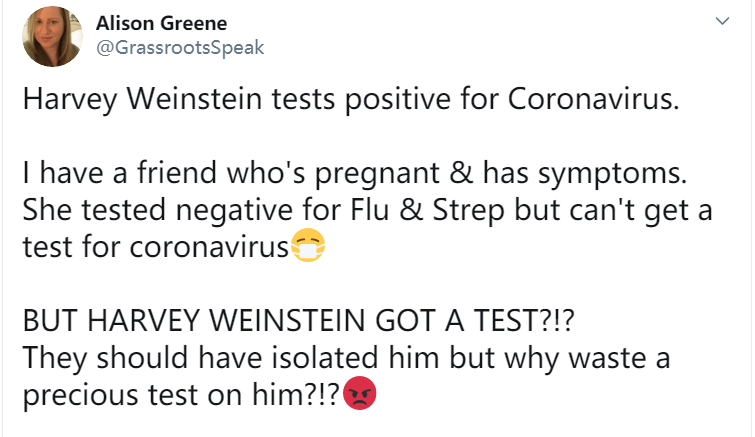 一条高赞推文写道:“我一个出现症状的孕妇朋友,无法得到新冠病毒检测,为什么韦恩斯坦居然能被检测?他们该把这人隔离起来,不该把宝贵的检测浪费在他身上。”