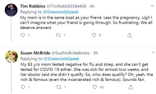 这条已经3000多赞的推文下,引来不少同病相怜的其他网友,他们纷纷表示,自家年迈且症状持续很久的老母亲,也没得到检测机会。